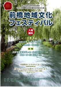 群馬県文化協会連合会では、地域的な市町村の圏域を単位として、地域レベルの文化活動の促進と地域文化の振興・交流を図る目的として「地域文化フェスティバル」を例年開催しています。本年度は昌賢学園まえばしホール(前橋市民文化会館)を会場として「前橋地域文化フェスティバル」を開催します。本協会の12の団体が舞台発表、また茶道部会による「呈茶サービス」と華道部会による「華道展」を行います。プログラム等については、こちらをご覧ください。(PDF)