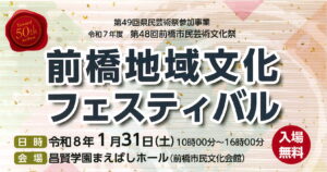 【日 時】1月31日(土)10時00分~16時00分 【会 場】昌賢学園まえばしホール(前橋市民文化会館) 群馬県文化協会連合会では、地域的な市町村の圏域を単位として、地域レベルの文化活動の促進と地域文化の振興・交流を図 […]